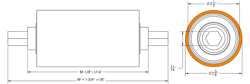 The Model SG roller is spring retained, constructed of a 2-1/2" diameter 11 gauge galvanized steel tube and an 11/16" hex plain steel shaft.